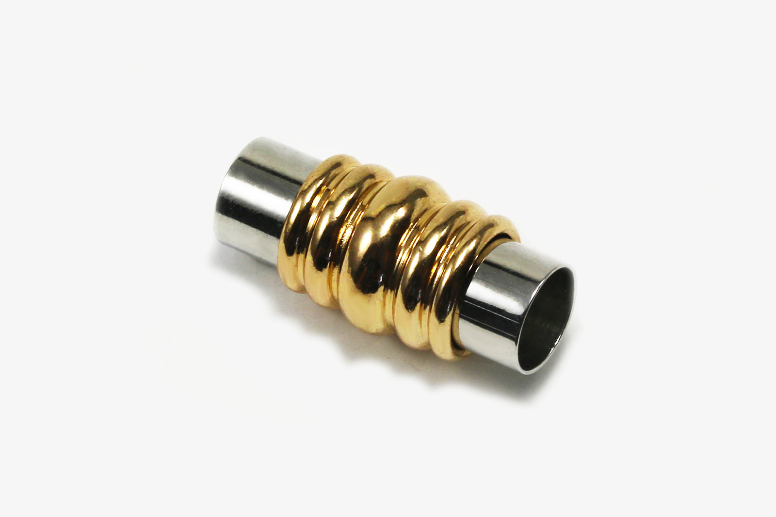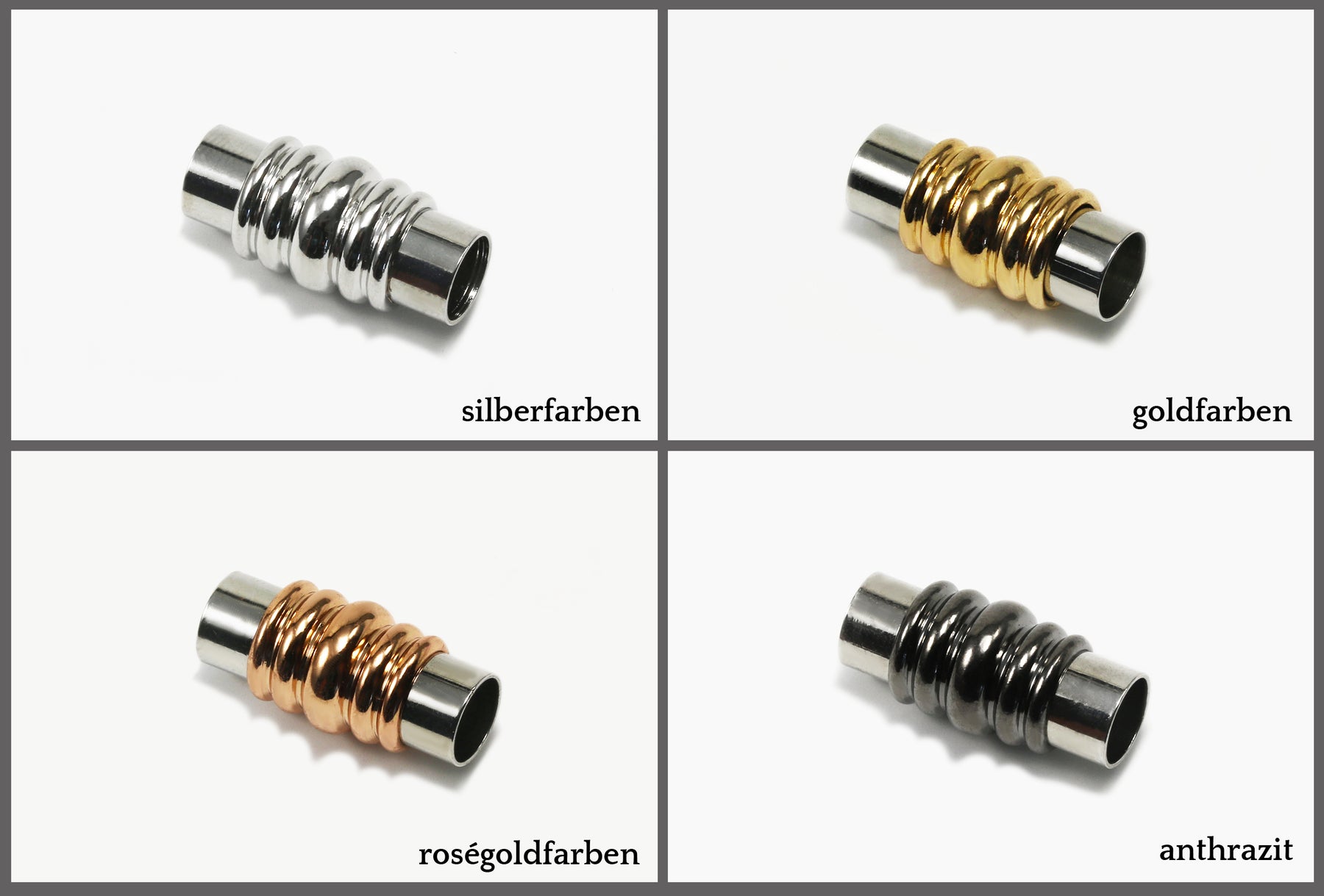 Entdecken Sie unseren eleganten Magnetverschluss für Bänder mit einem Durchmesser von bis zu 6 mm, der durch seine einfache Handhabung und stilvolle Optik besticht.