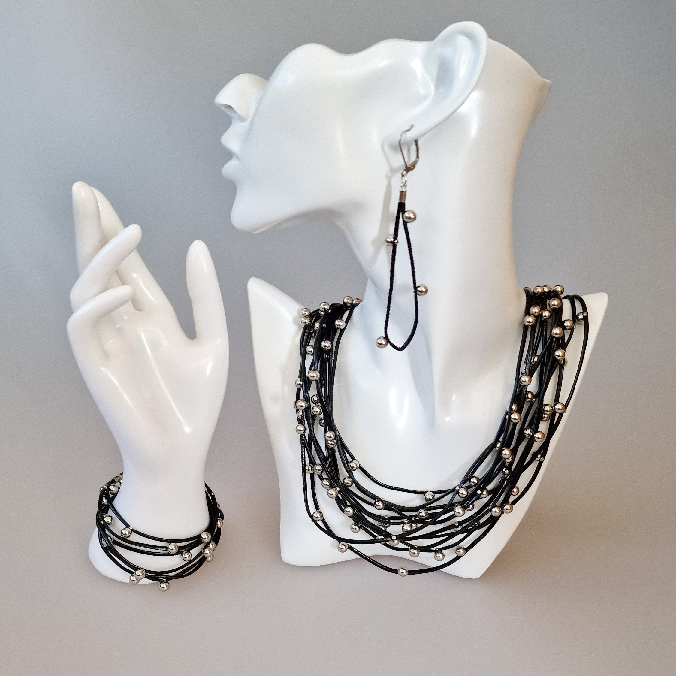 Modernes DIY Set aus Halskette, Armband und Ohrringen aus Leder und Silberperlen