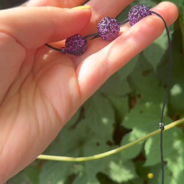 Dieses DIY Halsband besticht durch seine auffälligen lila Kristallperlen, die auf einem schwarzen Lederband aufgereiht sind. Kerstin verleiht dem Halsband mit den funkelnden Perlen einen glamuourösen Touch, während das schlichte Band für einen modernen und eleganten Look sorgt.
