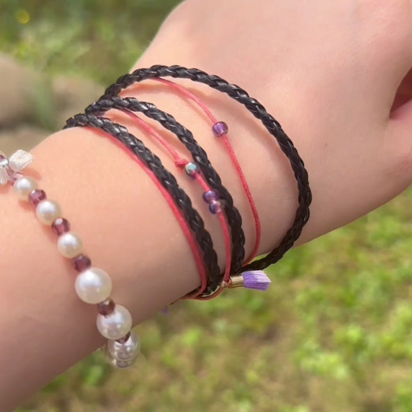 Kerstins farbenfrohes DIY Armband-Set vereint die natürliche Schönheit von Perlen mit der modernen Textur von geflochtenem künstlichem Lederband. Die Kombination aus lila Quasten, roten und schwarzen Lederbändern und zarten Perlen passt perfekt zu den Schmucktrends 2024.